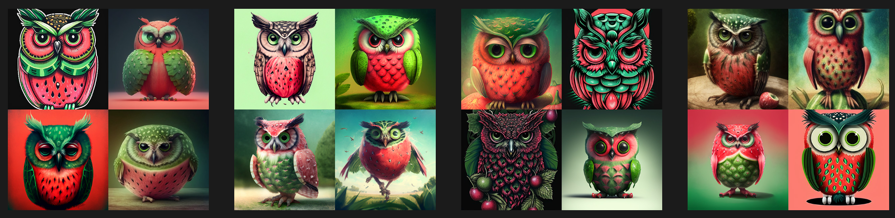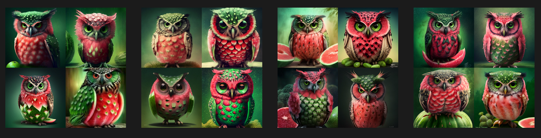This is when Chaos is 0, the consistency will be higher, the way the watermelon and owl fusion, in the four outputs are more similar, in addition, in a single output, the style of the four graphs (quadrangle) is also more similar:
