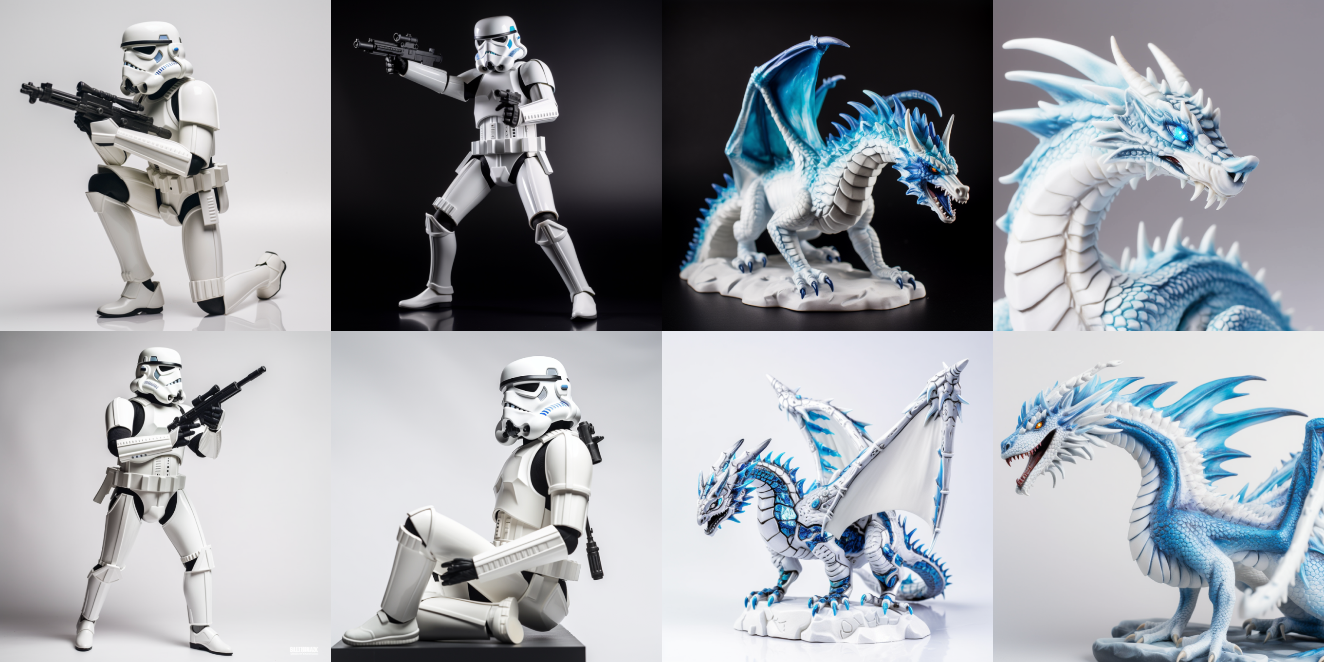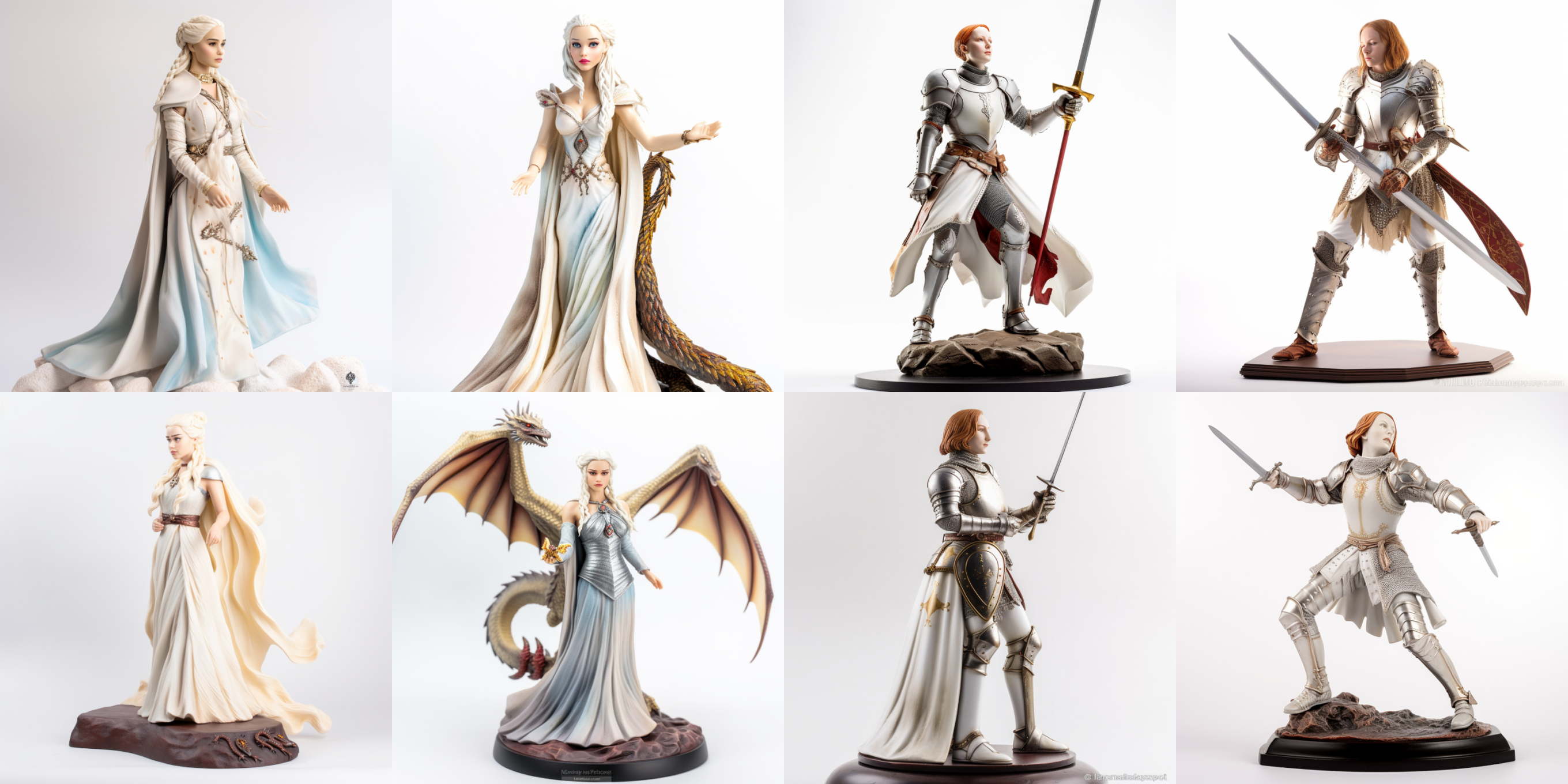 | Environment | white background, studio lighting | To highlight the figurines, emphasize the white background and lighting: add some lights to accentuate the product. |