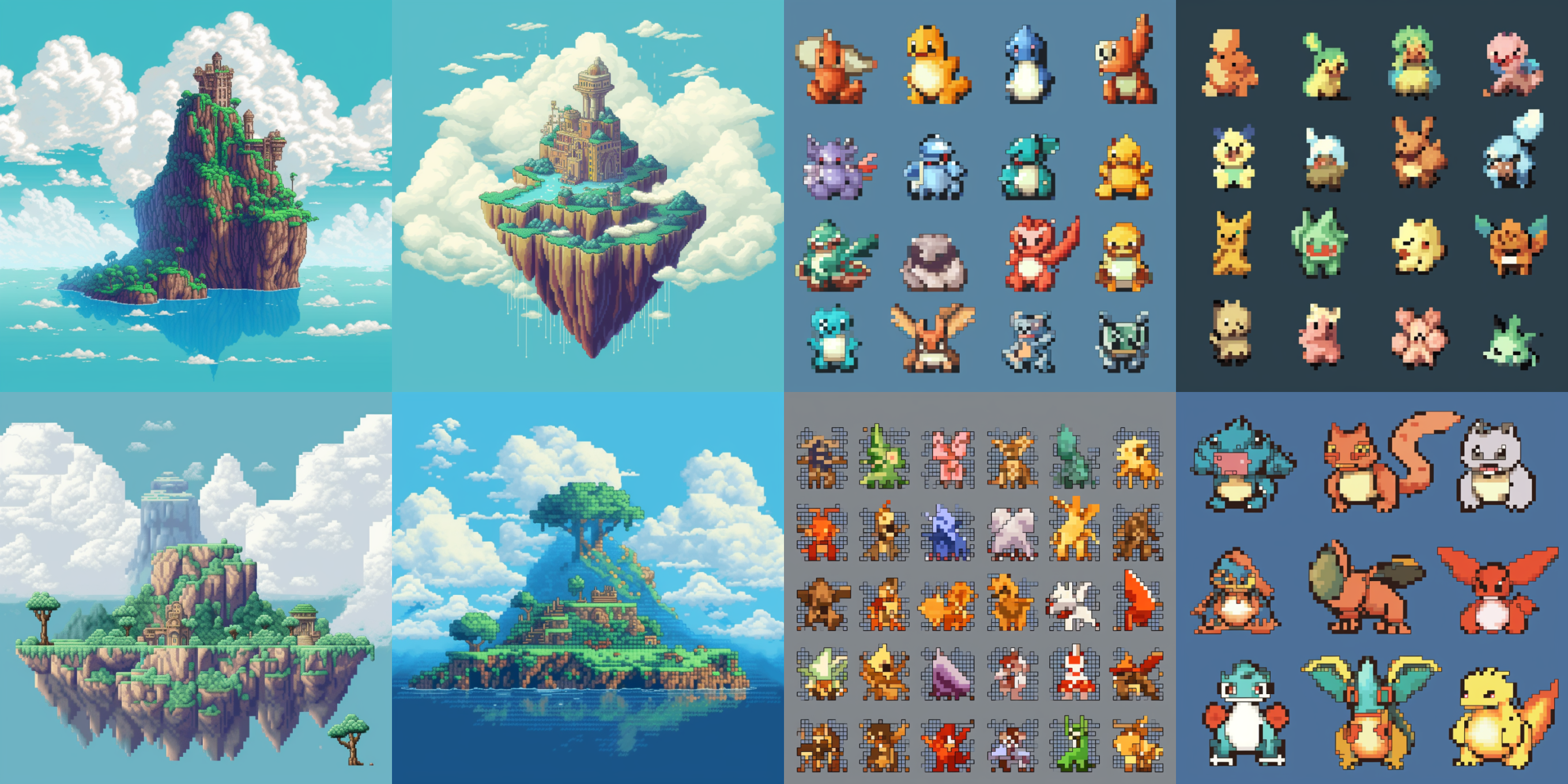 Everyone can try it out for themselves. Let me introduce a prompt I wrote. Recently, the latest installment of Zelda, "Breath of the Wild," was released and I really liked their Skyloft setting. So, I used Midjourney to create a 16-bit pixel art version: