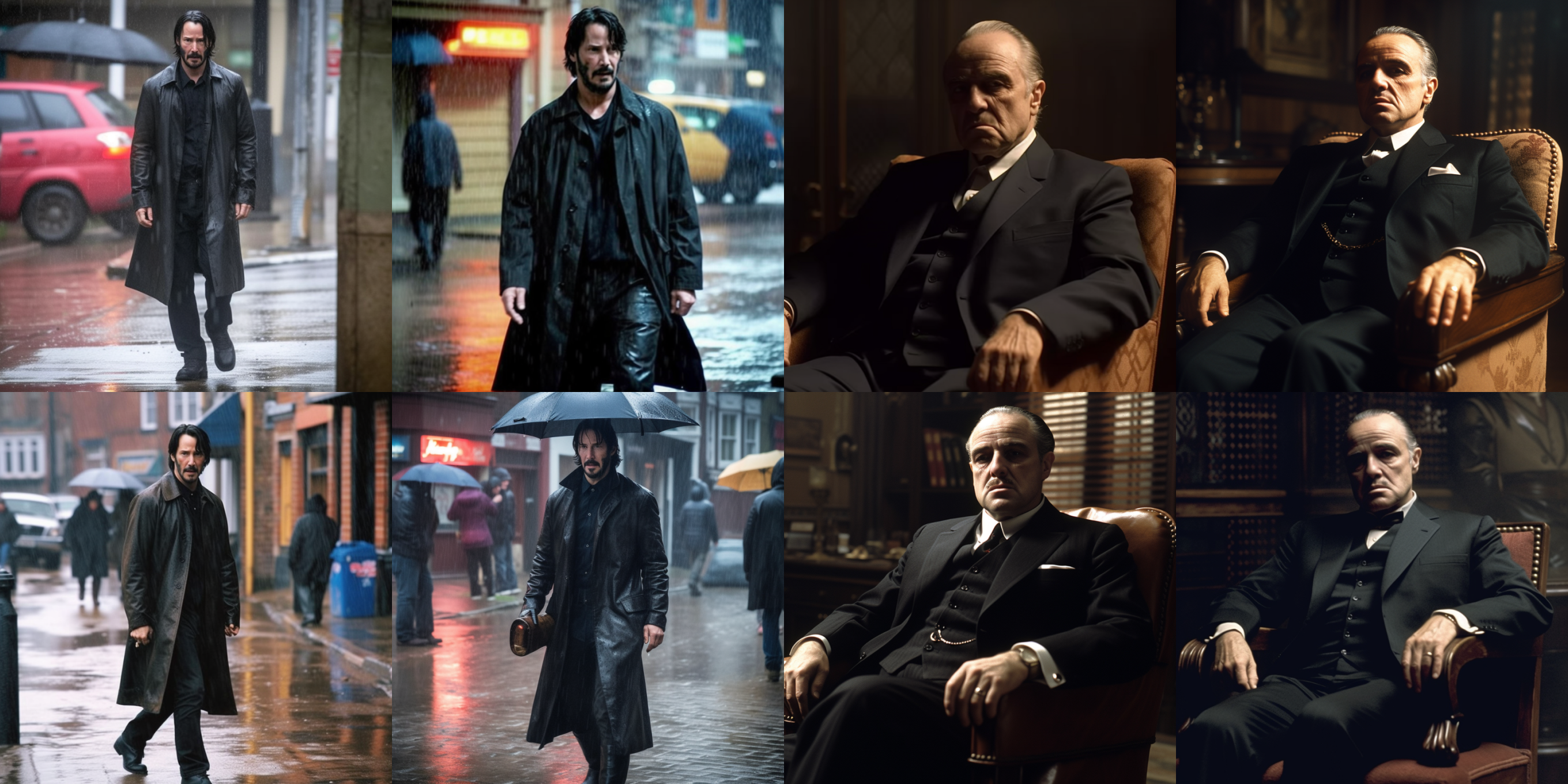 The first one is Keanu Reeves, the second one is Vito Corleone (I did not input the lead actor Marlon Brando), and both sets of prompts for the two pictures are very simple. You can try writing them yourself ๐