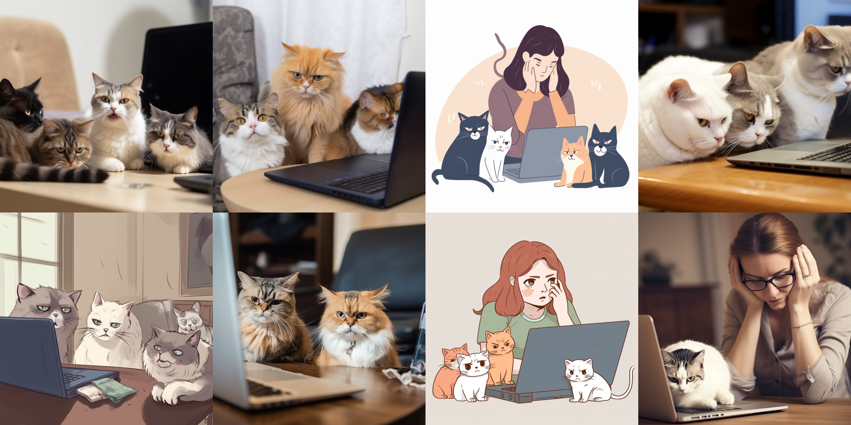 Generated pictures (four pictures on the left), the cats are looking at you (you may be the crying woman ๐), if you use the function of slider (four on the right), crying woman will appear in the picture:
