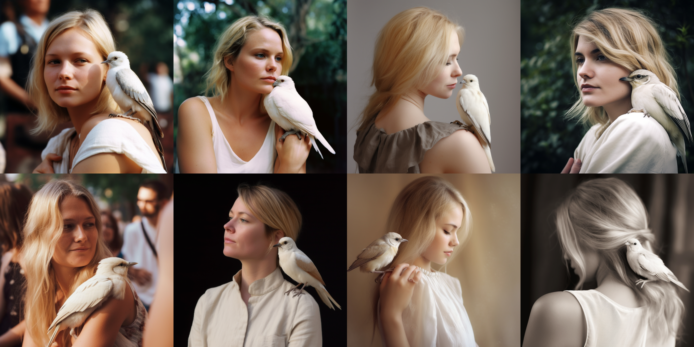 A songbird sits on the shoulder of a shy blonde woman dressed in white.