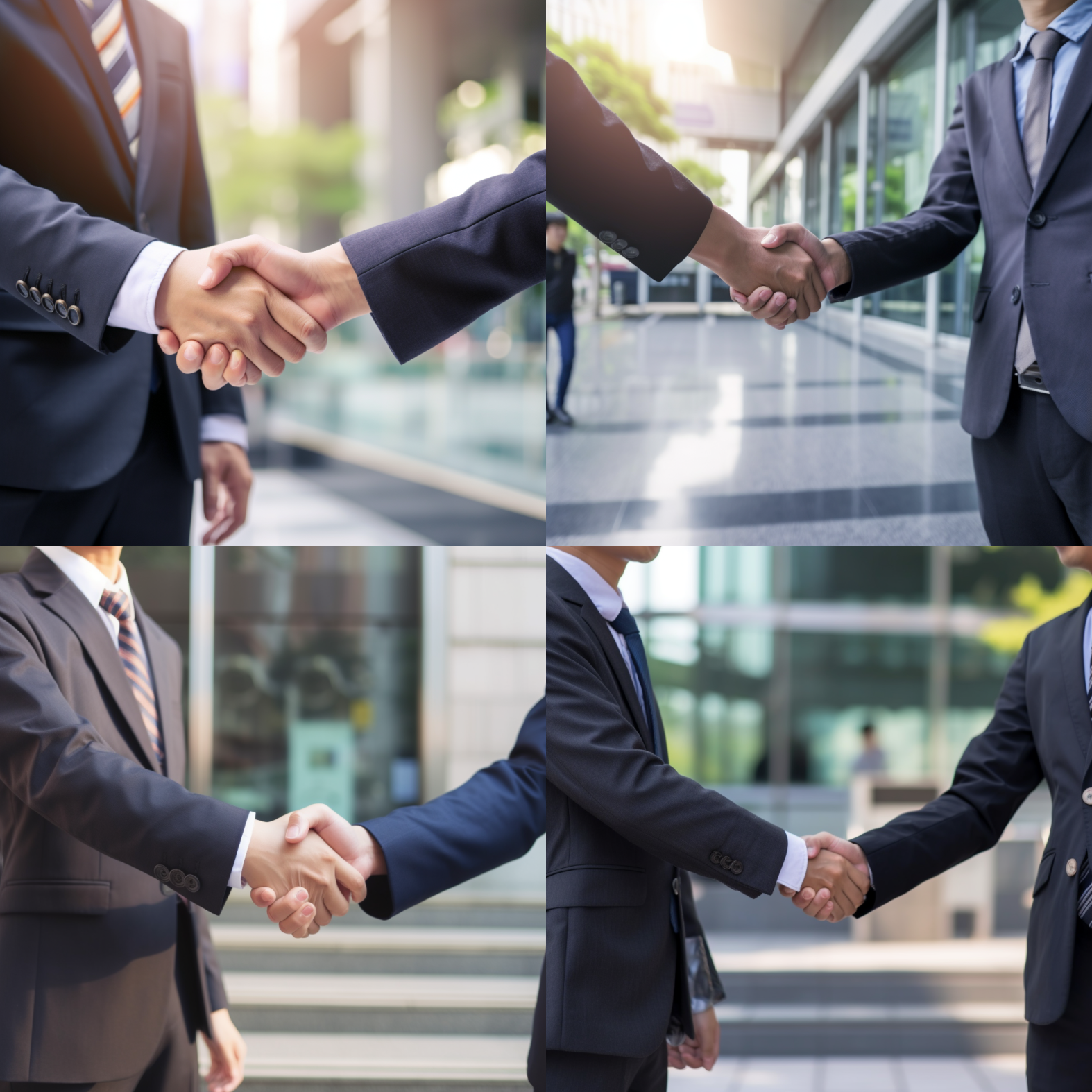 two Asian men in suits shaking hands,say goodbye in front of the main entrance of the office building, focus on two hands, taken with Canon, background bokeh