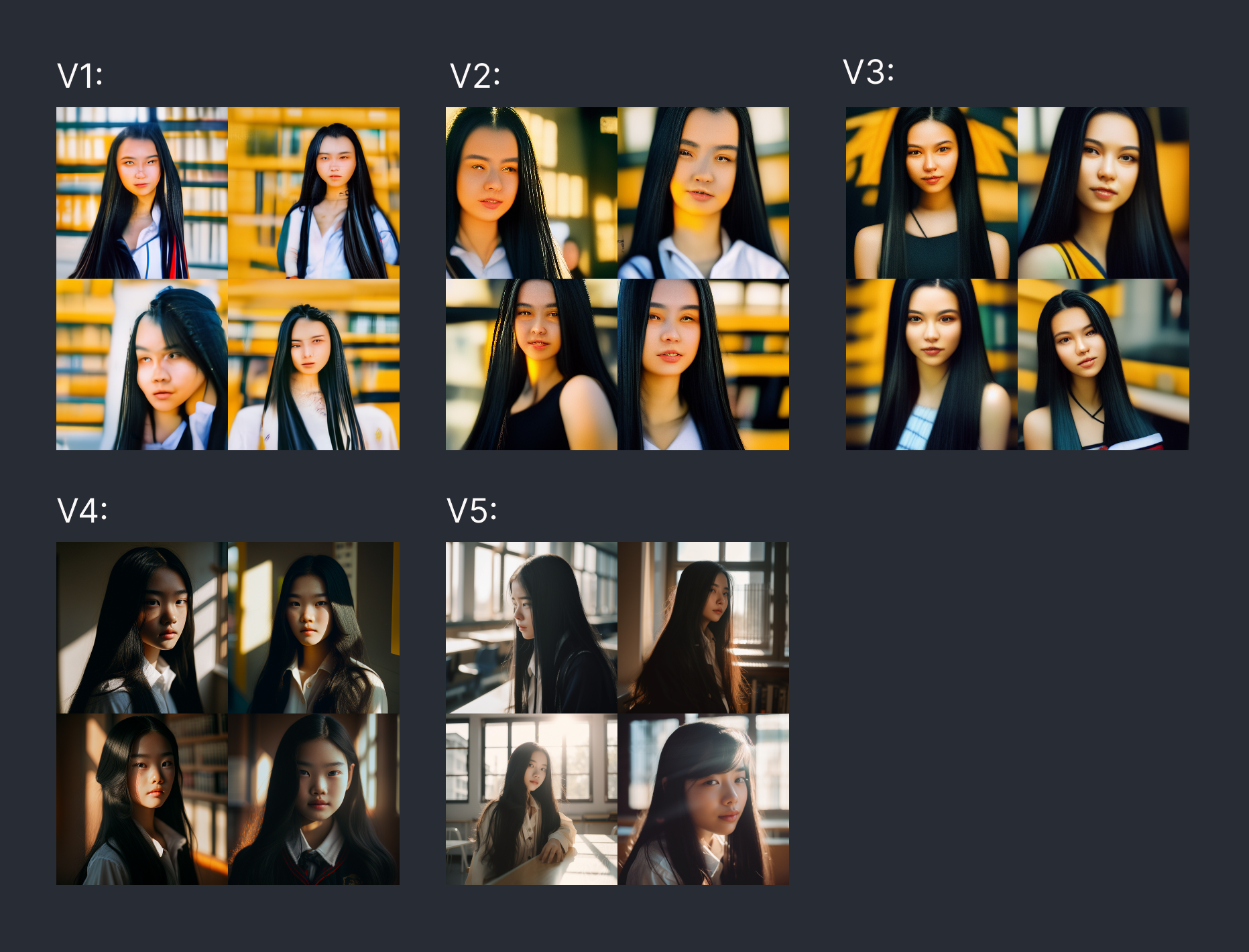Increasingly rich details and more realistic generated content. V1 and V2 are basically sketches.
